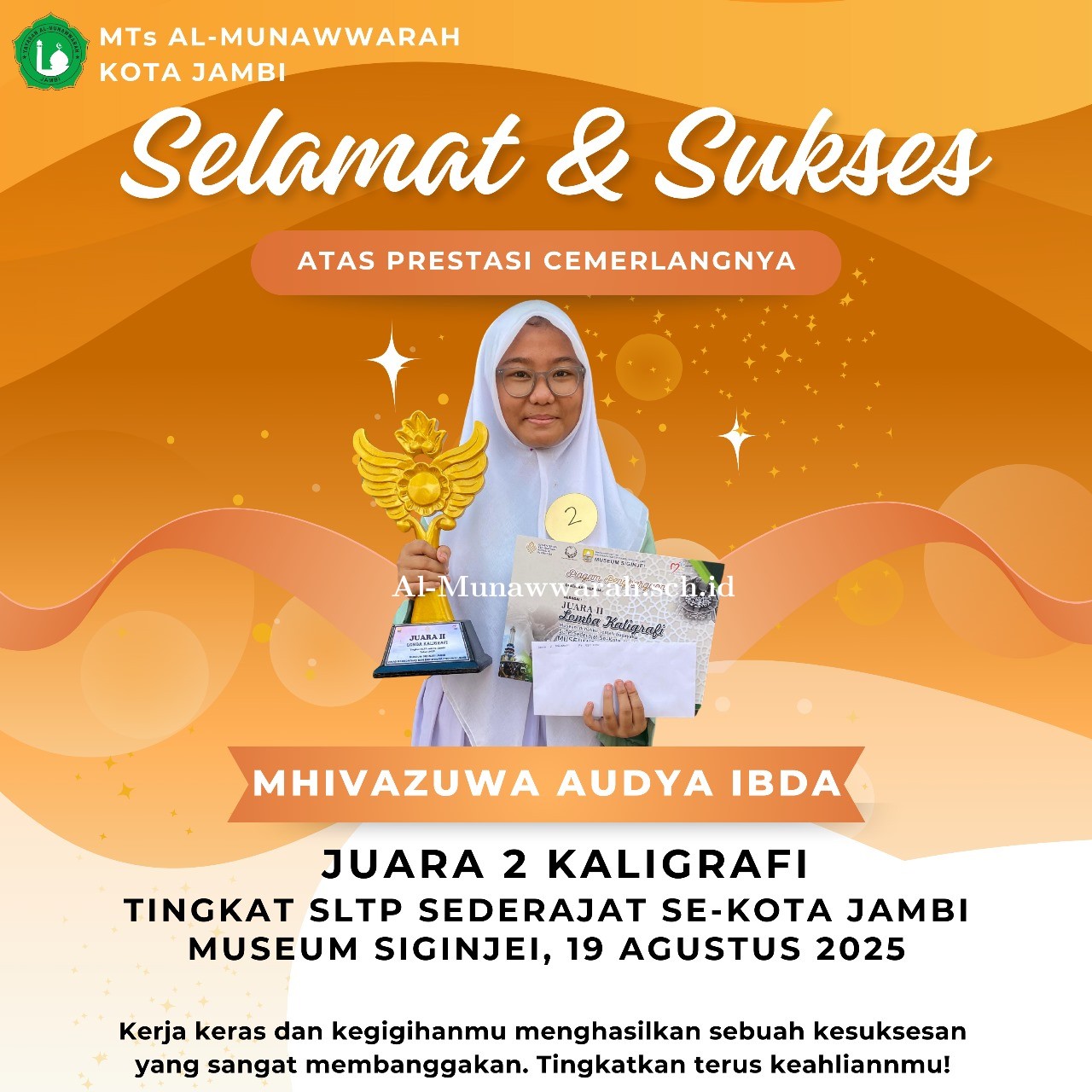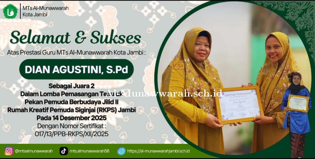 Jambi(mtsalmunawwarahkotajambi) Guru MTs Al Munawwarah yaitu Ibu Dian Agustini, S.Pd sukses mendapatkan juara 2 pada Lomba . . . 0